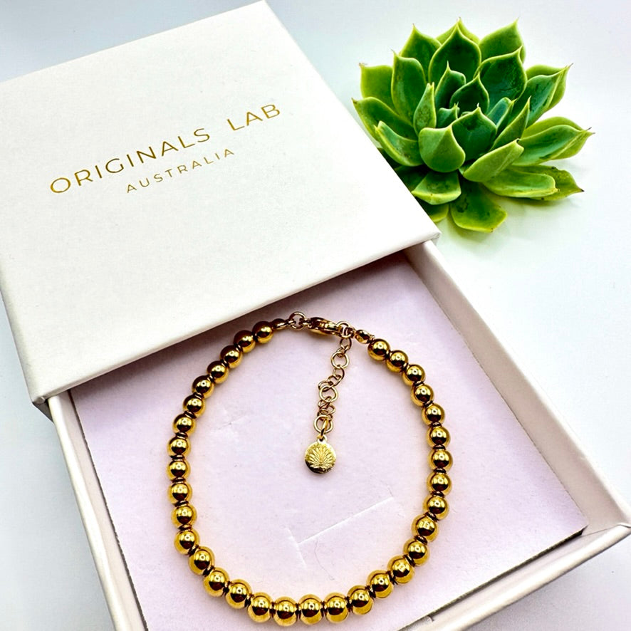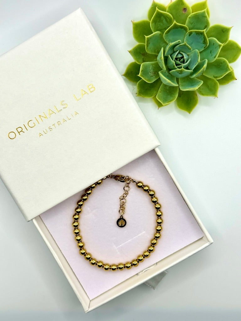 The bracelet is handcrafted with 5mm 18k gold plated orbs and an iconic Originals Lab Fan Palm charm.